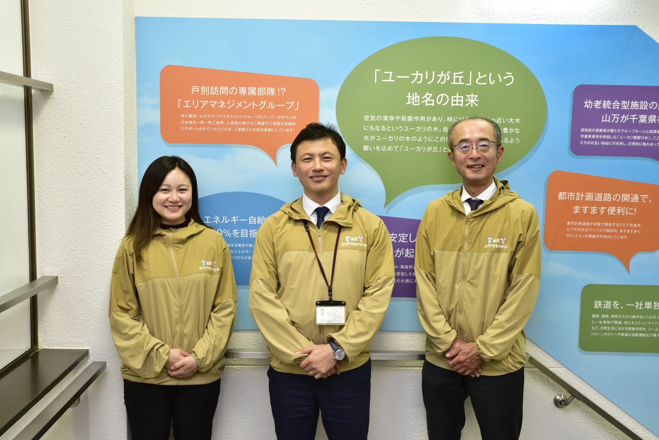 ユーカリが丘にお住まいのご家庭一軒一軒を訪問して、なにかお困りのことがないか、街に対してのご要望がないかを日々伺って回っているのが「山万 エリアマネジメントグループ」です。2009年の発足から現在まで、住民の皆様からたくさんのお声をいただき、それらを山万社内の各担当部署へ届けながら、ユーカリが丘の街が一歩ずつでも成長していくことを目指して日々活動を続けています。